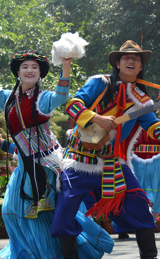 彝族在云南境內(nèi)約471萬人,是省內(nèi)人口最多、分布最廣的少數(shù)民族,主要聚居在金沙江、元江流域和哀牢山、無量山腹地。彝族是一個能歌善舞的民族,民間打歌、跳樂之風(fēng)盛行,大三弦、跌腳舞久負(fù)盛名?;鸢压?jié)是彝族最具特色的民族節(jié)日。彝族村占地50余畝,三虎浮雕墻與虎頭內(nèi)祖師形象表現(xiàn)了彝族虎鷹文化。太陽歷廣場圖騰柱上有太陽、虎、火和八卦圖形象,周圍環(huán)繞著10個朝向不同的月球造型,外圓周有12生肖石雕。依山而建的“...